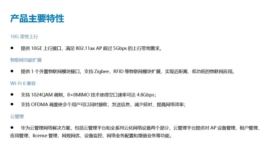 AP7060DN是华为发布的新一代802.11ax无线接入点,内置全向天线,整机速率高达6Gbps,其中2.4G频段支持4x4 MIMO和4条空间流,速率1.15Gbps;5G频段支持8x8 MIMO和8条DN支持空间流,速率4.8Gbps。